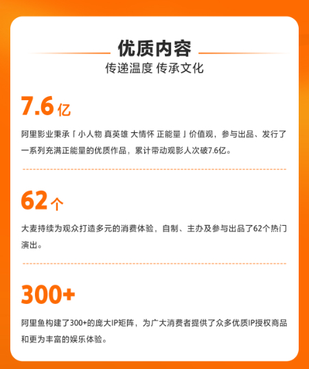 报告期内,阿里影业旗下IP交易及创新平台阿里鱼的IP矩阵已达300+,为广大消费者提供了众多优质IP授权商品和更为丰富的娱乐体验。