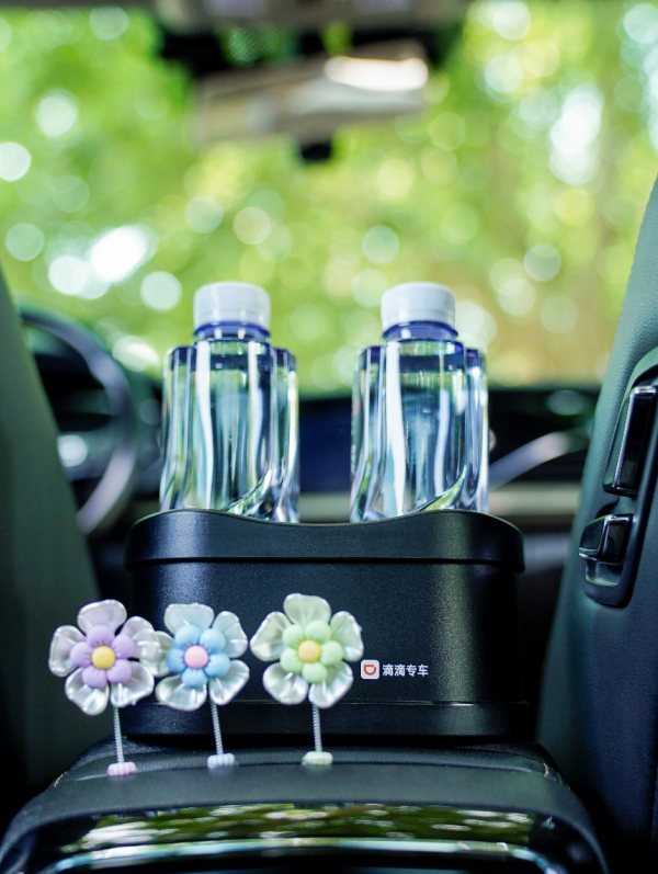 为了能让乘客在行程中更安心、更放心,滴滴专车车内配备饮用水、车载手机充电线以及抽纸等多款物品。悬挂在前排座椅靠背上的定制香片,希望能让乘客的行程多一分舒适。