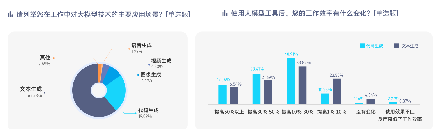 从大模型产品的用途来看,文本生成的占比最高,使用人群占比为64.72%,其次是代码生成,占比19.09%。但从对工作效率的影响来看,使用大模型进行代码生成的职场人提效更明显,4成使用者自述提效10%-30%,更有45%的使用者自述提效30%以上。而在文本生成方面,1/3的使用者提效10-30%,也有近4成使用者提效30%以上。