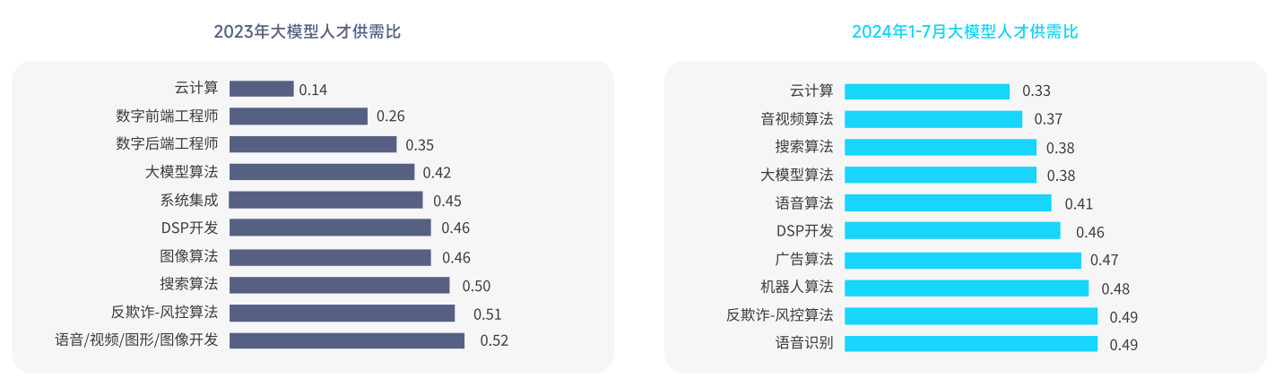虽然大模型领域整体人才饱和,但部分技术人才仍然供不应求。2024年1-7月,大模型算法、技术类人才的招聘数量、人才紧缺度均位居前列。大模型领域热招岗位TOP10中有9个为技术岗位,算法工程师是新发岗位量最大的岗位,招聘指数为28.78。云计算成为人才最紧缺的岗位,人才供需比0.33,相当于3个岗位争夺1个人才。值得关注的是,云计算、搜索算法、大模型算法、DSP开发、反欺诈-风控算法5个岗位连续两年位居人才紧缺度前十。