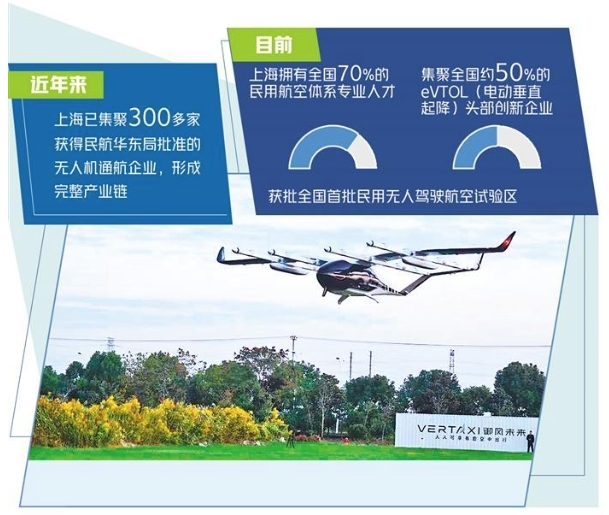 作为民用航空产业“第一城”,近年来,上海已集聚300多家获得民航华东局批准的无人机通航企业,形成了研发、系统、零部件、整机、应用及服务的完整产业链。目前,上海拥有全国70%的民用航空体系专业人才,已集聚全国约50%的eVTOL(电动垂直起降)头部创新企业,获批全国首批民用无人驾驶航空试验区,金山“海—岸—城”场景物流运输、杨浦城市低空智慧物流配送、徐汇滨江无人机集群表演、长三角区域跨城低空载客运营等应用场景逐步深化拓展。