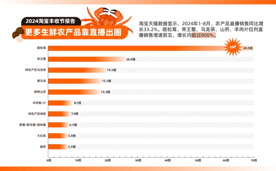 报告显示,2024年1-8月,淘宝天猫平台农产品直播销售同比增长33.2%。在销售额超过1000万元的农产品中,直播销售实现3倍以上增长的品类就达到了20个。姬松茸、帝王蟹、乌龙茶、山药片、羊肉卷排在前五,增长均超过800%。