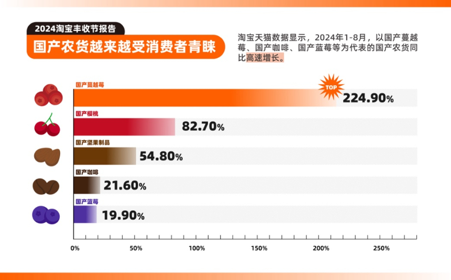 90后是淘宝购买农产品的绝对主力,他们对国货的热爱也体现在了农产品上。报告显示,国产品牌蔓越莓、国产品牌樱桃、国产品牌坚果制品、国产品牌咖啡、国产品牌蓝莓的销量同比均实现20%以上增长。
