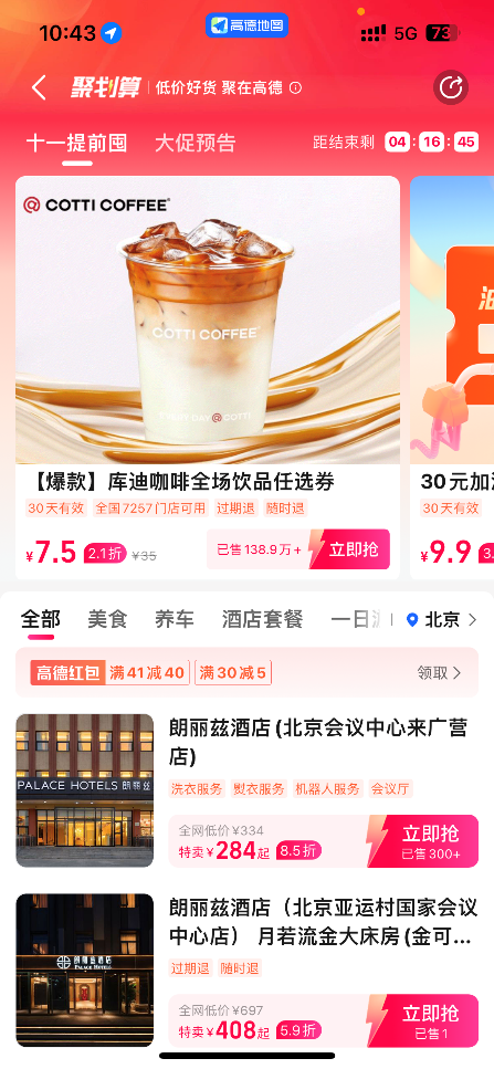 9月25日起到10月7日,优惠补贴覆盖酒店、旅游、大交通(火车票、机票、客车)、加油、洗车、美食、生活服务、休闲娱乐、电影等多出门生活全场景全品类,多订多省;其中高价值爆品丰富多样。即日起,用户在高德地图APP上搜索“高德聚划算”,即可进入活动会场。