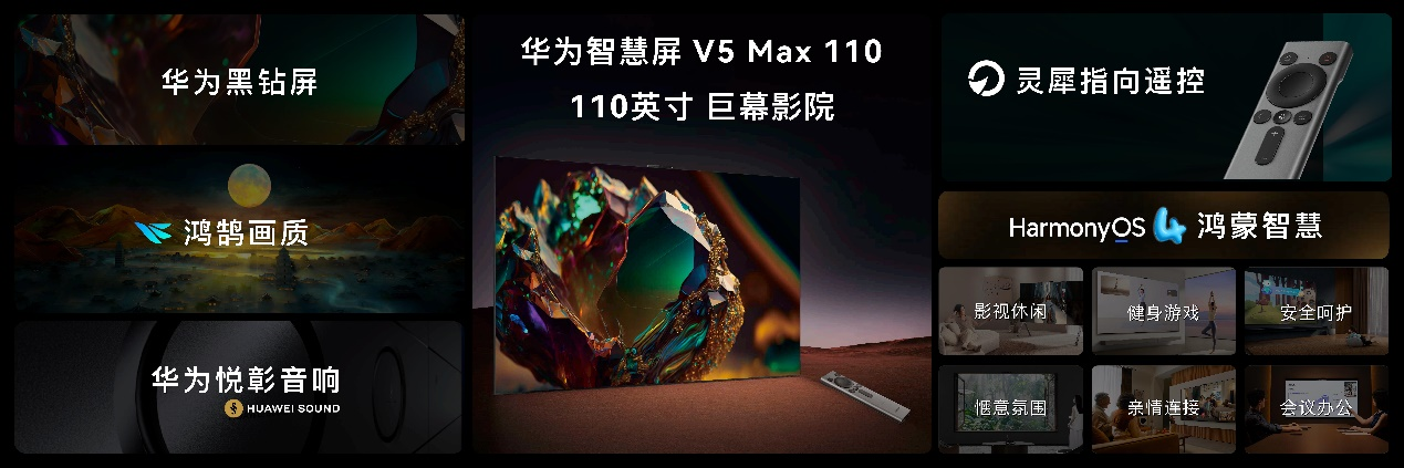 华为智慧屏 V5 Max 110支持华为灵犀指向遥控,延续了“像玩手机一样玩电视”的交互能力,加上丰富的智慧体验,力求满足用户对旗舰大屏电视的全部想象,“巨幕手机”进入百寸非凡巨幕新潮流。