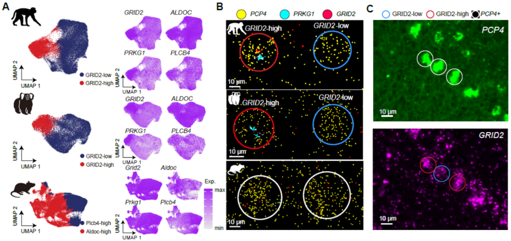 值得一提的是,研究人员发现灵长类的浦肯野细胞进化出了特有的亚型,分别高表达和低表达GRID2基因,而鼠类小脑浦肯野细胞中GRID2的表达相对均一。灵长类特有的浦肯野细胞亚型在诱导长时程抑制相关基因表达上有显著差异,预示着其在突出可塑性和学习记忆过程中的功能差异。