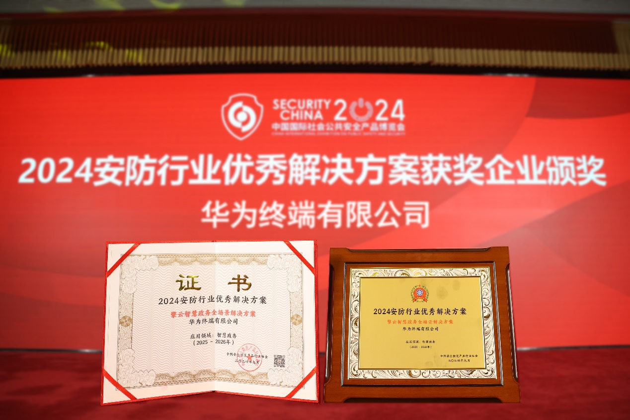 在展会期间由中国安全防范产品行业协会组织的”2024安防行业优秀解决方案”评选结果正式揭晓,华为擎云携手合作伙伴打造的擎云智慧政务全场景解决方案获得“2024安防行业优秀解决方案”奖。