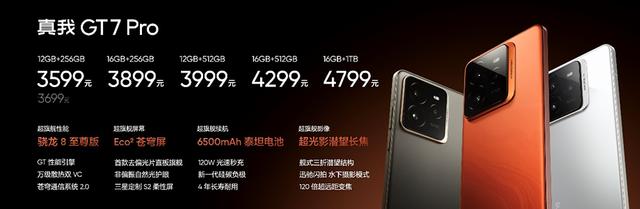 售价方面,真我GT7 Pro,具体售价如下:12GB+256GB版本售价3699元,首销价3599元;16GB+256GB版本售价3899元;12GB+512GB版本售价3999元;16GB+512GB版本售价4299元;16GB+1TB版本售价4799元。将于11月4日在京东开启“先人一步计划”,11月11日全渠道正式开售。