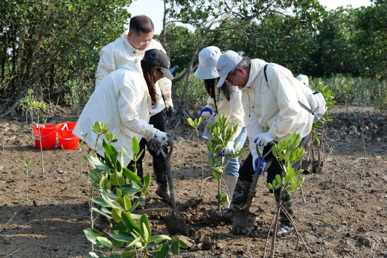 公益商家志愿者在保护地清理鱼藤后补种本土红树苗