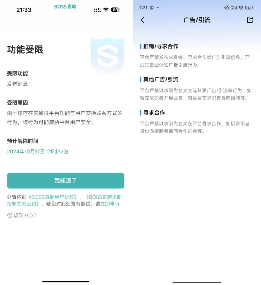 为打击此类行为,BOSS直聘对相关行为制定了严格的处置规则。求职者如在聊天过程中遇到发送广告引流信息、变体联系方式的行为,可直接举报该招聘者。