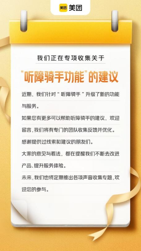 为了让爱心接力棒持续传递,美团同步在官微上线意见收集栏,专项收集关于“听障骑手功能”的建议,希望倾听更多声音。未来,美团还将定期推出各项声音收集专题,希望大家将日常生活中发现的需要的产品,和更好的功能在官微反馈,帮助美团为更多需要的人提供服务。