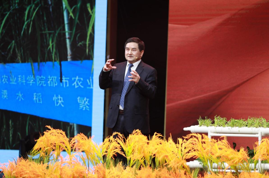 中国农业科学院都市农业研究所首席科学家杨其长在分享沙漠水稻科技成果