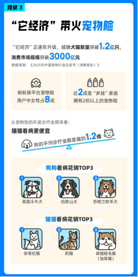 2024年,宠物“它经济”继续走热,城镇犬猫数量突破1.2亿只,消费市场规模突破3000亿元,这也让宠物险成为2024年保险行业无法被忽略的现象。蚂蚁保的《年度观察》显示,宠物险用户中女性占了8成。宠物险用户中,有近2成用户买了2份以上的宠物险。