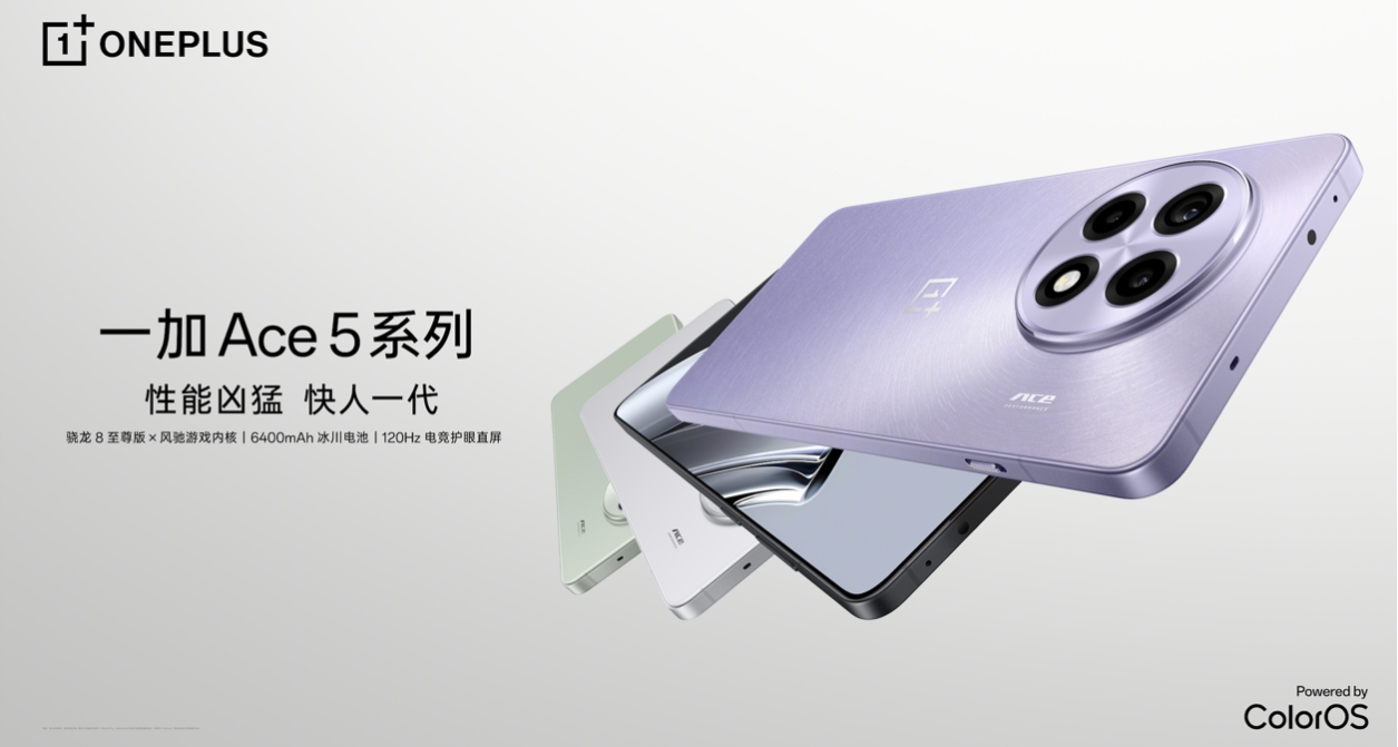 12月26日,一加正式发布一加Ace 5系列——一加Ace 5 及一加Ace 5 Pro。一加Ace 5系列深度聚焦性能和游戏体验,搭载骁龙8系旗舰平台和自研芯片级游戏技术“风驰游戏内核”,带来满帧的流畅游戏体验。一加Ace 5系列采用全新直屏设计以及同档唯一陶瓷机身,首发1.5K第二代东方屏,搭载行业最高能量密度冰川电池,还拥有旗舰影像和饱受好评的“机圈德芙”ColorOS 15等众多行业领先的硬件和功能配置,带来远超同档的旗舰体验。