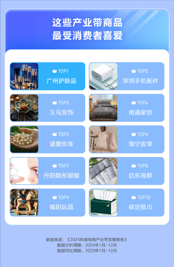 12月31日,抖音电商发布《直播间里的中国制造——2024抖音电商产业带发展报告》,全面盘点2024年全国产业带地区实体经济和中小商家在该平台的发展情况。