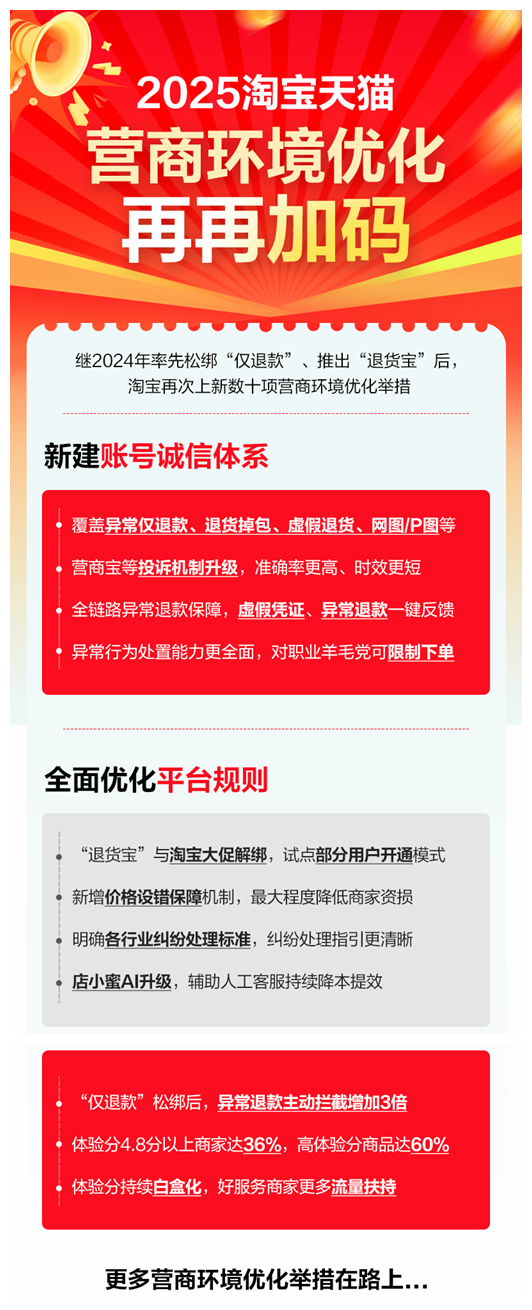 在2024年于电商行业松绑“仅退款”、推出“退货宝”后,围绕平台高质量发展,淘宝再次“上新”数十项营商环境优化举措,保障商家权益。