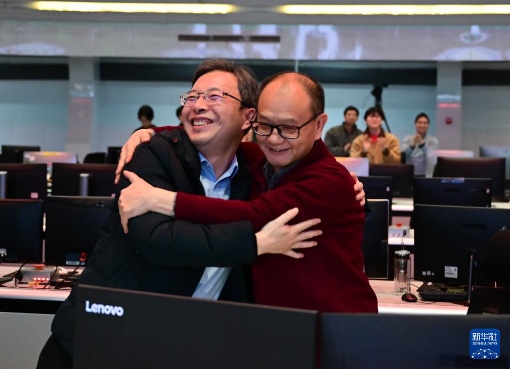 1月20日,EAST物理实验总负责人龚先祖(右)和中国科学院合肥物质科学研究院等离子体物理研究所副所长陆坤拥抱庆祝。新华社记者 周牧 摄