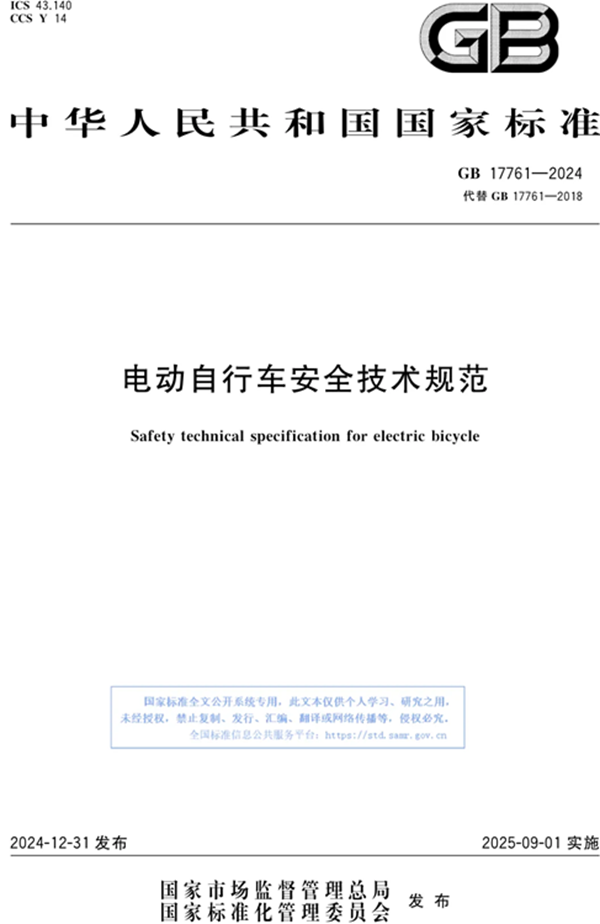 电动自行车新版标准来了。由工业和信息化部、市场监管总局会同公安部、应急管理部、国家消防救援局组织修订的强制性国家标准《电动自行车安全技术规范》于2024年12月31日发布。新标准将于2025年9月1日正式实施,此后所有新生产的电动自行车都必须符合新标准要求。
