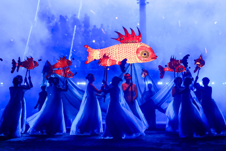 比赛间隙,年味巡游、舞狮、鱼灯、英歌舞等表演轮番上演,一场足球与民俗的碰撞引来现场观众的阵阵欢呼。由机械醒狮领衔的巡游方阵展现了传统醒狮技艺;佛山非遗鱼灯方阵为观众送上一场精彩绝伦的视听盛宴;英歌舞表演则展现出力与美的完美结合……