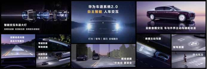 尊界S800的华为车语系统2.0搭载迄今最强大的HUAWEI XPIXEL智能交互车语大灯,双灯精准融合像素260万,单像素精度达0.02m,投影清晰度0.4MTF,近场投影距离为3m,与HUAWEI ADS及NearLink星闪技术全域融合,实现精准遮蔽,不炫目、更安全。创新动态光毯,可实现自主行车指引,智驾人驾都支持,弯道变道,精准跟随,识别窄道,自主示宽。智驾意图、行人安全、救援均可主动沟通,实现车与外界的全新交互体验。