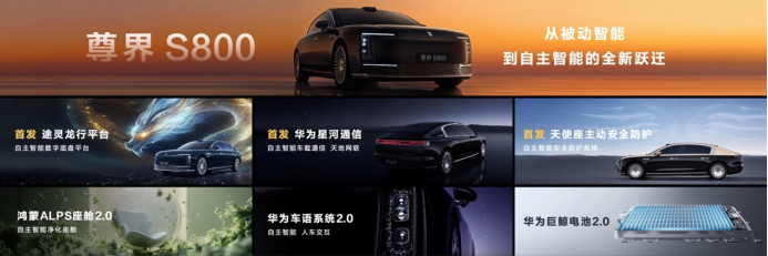 尊界S800搭载自主智能数字底盘平台——华为途灵龙行平台,独创全域融合架构。依托融合感知预测网络实时感知路况信息、车辆信息、驾驶员意图信息等信,应用时空推理悬架网络、全维协同控制模型与华为数字底盘引擎的中央集中全维协同控制,通过一体化决策达到毫秒级响应。途灵龙行平台拥有主动感知、中央控制、智能推理、自主学习四大特性,实现车辆超机动、超安全、超舒适、超灵活的驾乘体验。