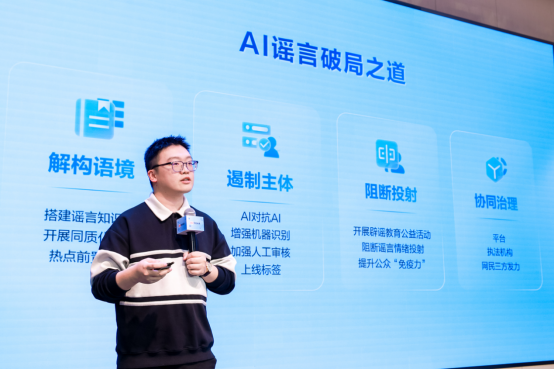 清华大学新闻与传播学院副教授陆洪磊指出,生成式AI正在重塑谣言的传播生态,技术的加持让AI谣言无论在空间、速度还是结构、方向、效果上,都更具“说服性”、虚假性和强传播性,使得传统辟谣手段难以招架。陆洪磊表示,今日头条近年来构建起涵盖内容治理制度、内容审核、辟谣教育、内外联动的四位一体防御工事,取得了较为显著的效果,对于AI谣言治理提供了一条具有可行性的发展之路。此外,道阻且长,也需要多方力量联合:比如执法机构需要做好法治保障的护盘手,建立“技术取证-电子证据-司法鉴定”的全链条执法标准;而每位用户也都应当成为理性的受者和传者,对可疑内容主动进行核实。最后,陆洪磊呼吁有更多像今日头条这样的平台携手,共同应对网络乱象治理。