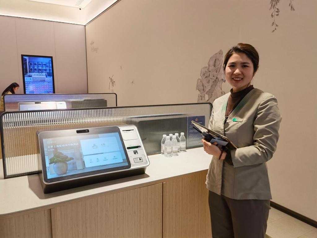 2月18日,在上海一家酒店内,前台服务人员站在智能自助入住机旁边迎接住客。新华社记者 陈爱平 摄
