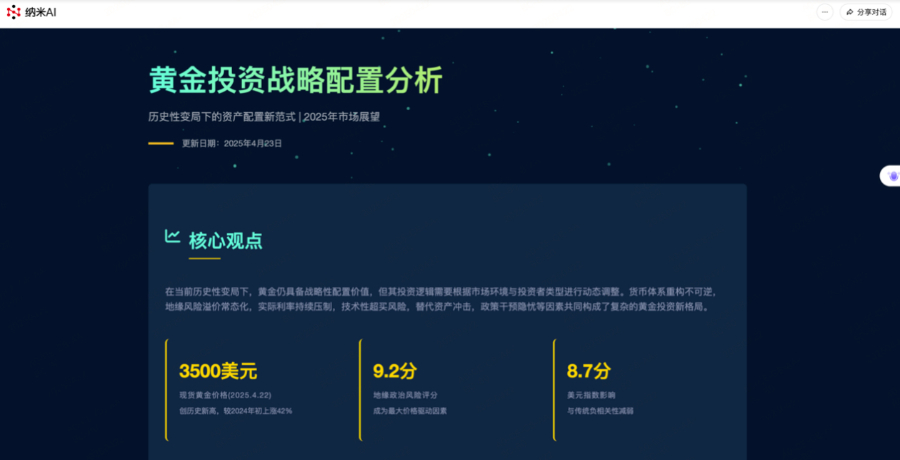 官方介绍,在纳米AI客户端内找到万能工具箱,选择“纳米AI超级搜索”等MCP工具,以“最近两家有外卖业务的公司正在激烈竞争,分析他们的财报,告诉我该购买哪一家的股票”为指令开始测试,调用了上述工具的大模型会自动提取两家公司的财务数据和业务发展信息,10余分钟便生成内容扎实、设计酷炫的结果。在纳米AI站内,点击创建智能体按键,在技能选择框里选择“热门新闻”工具,不到1分钟即可配置一个智能体,使用这个智能体分析2025年上海车展看点,智能体能快速给出逛展路线图、新能源车亮点对比、上海车展展馆分布与人流分析等多个维度的分析结果,其效率远超人工。