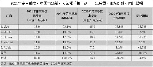 2021年第三季度,根据国际数据公司(IDC)最新的手机季度跟踪报告,中国智能手机市场出货量约为8080万台,同比下降4.7%。平均单价的持续上涨及产品创新力不足以刺激消费者换机周期缩短成为市场持续走低的主要因素。相比上半年,头部厂商的份额差距持续缩小,前五大厂商市场份额均已超过两位数。