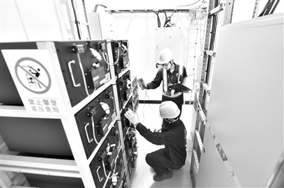 图为工作人员对杭州市余杭区超山风景区的5G基站进行蓄电池梯级利用优化改造工作。(国网浙江电力供图)