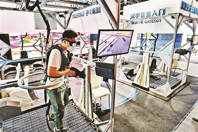 北青报记者来到全球数字经济大会“开元之境”元宇宙体验馆。首先看到了由专注VR技术研发的创新公司STEPVR带来的全球首款元宇宙登入门“国承1号”。在3平方米左右的空间内,体验者站在一个可以360度自由移动的全向运动系统中,戴上超轻薄VR头显、穿上带触感的震动马甲,通过这台机器,可以走进元宇宙的绿洲世界,体验各类热门游戏,甚至包括CS、MOBA类需要移动的对战游戏。