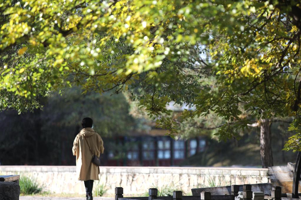 10月10日,游客在承德避暑山庄景区内游览。