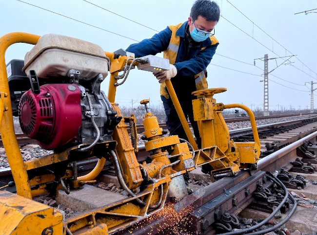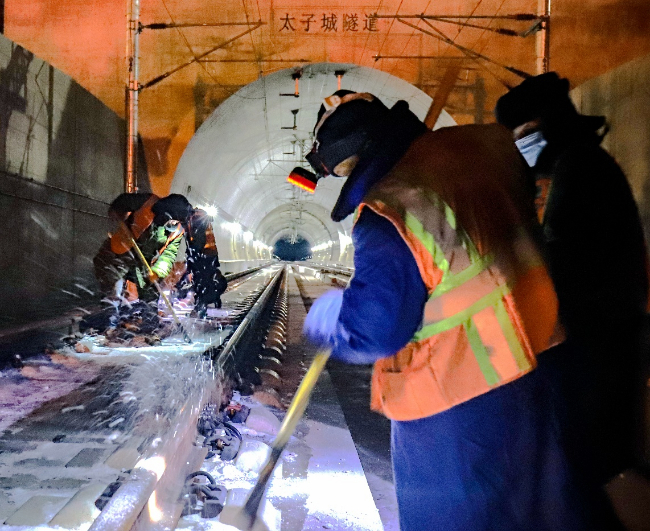 张家口工务段职工对京张高铁线路进行维修作业。