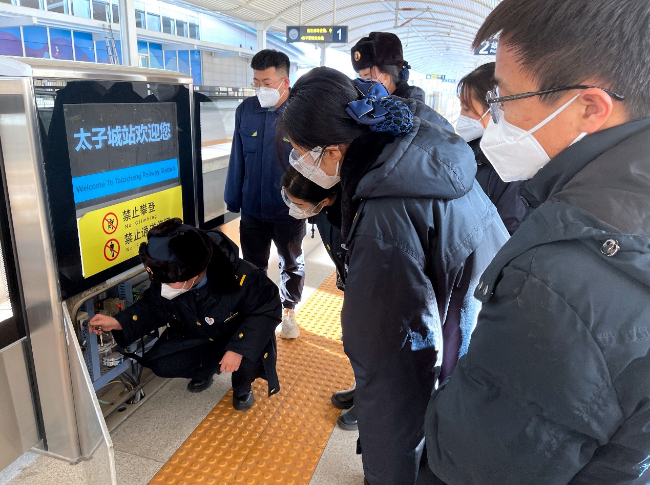 张家口车务段太子城站职工对站台设施进行检查维护。