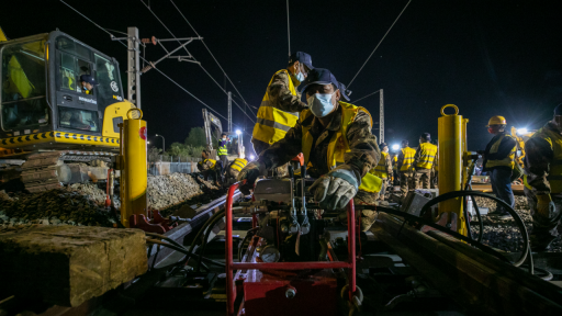 4月22日20时30分,在北京至唐山铁路(以下简称:京唐铁路)北京段施工现场,随着现场总指挥的一声令下,全国首次采用液压同步走行动力设备进行的42号道岔横移插入既有京哈铁路施工正式开始。本次施工共分2步进行,分别将上行和下行线路横移插入京哈线,计划于25日全部完工。该施工是京唐铁路与京哈铁路实现互联互通的关键,为京唐铁路的如期开通奠定了基础。