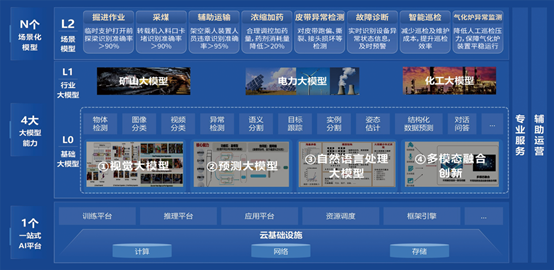 2023年7月18日,山东能源集团、华为、云鼎科技股份有限公司在济南联手发布全球首个商用于矿山领域的AI大模型——盘古矿山大模型,标志着人工智能在矿山领域应用方面迈出重要一步。依托该模型,云鼎科技构建“1+4+N”架构的矿山智能化方案,通过1个AI开发平台和4个盘古大模型能力,开发N个高价值应用场景,支撑AI大规模“下井”。