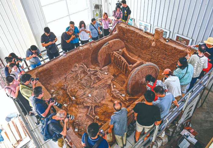 这是在陕西省考古研究院泾渭基地拍摄的西周晚期青铜轮牙马车。这套青铜轮牙马车2014年出土于陕西省宝鸡市岐山县周原遗址。新华社记者 李一博 摄