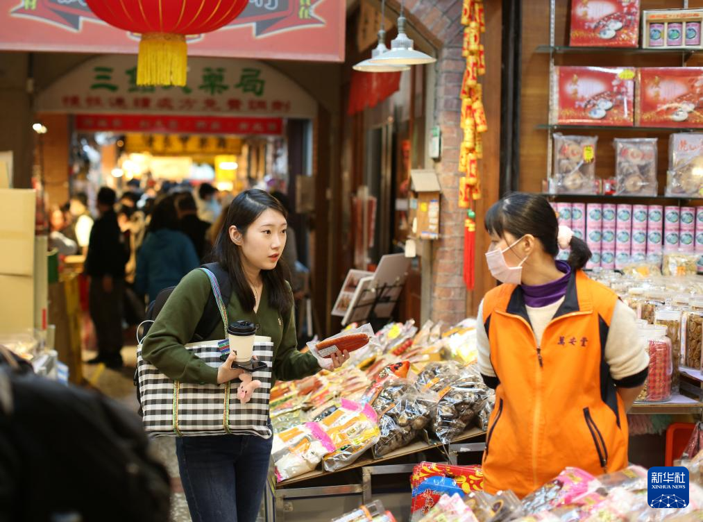 进入腊月,台北保存最完整的老街迪化街年味越发浓郁。“2025台北年货大街”开张迎客,古朴的街市张灯结彩,红灯笼、春联迎风摇曳,店铺内外各色年货摆得满满当当,叫卖声不绝于耳,采买年货的人们摩肩接踵。