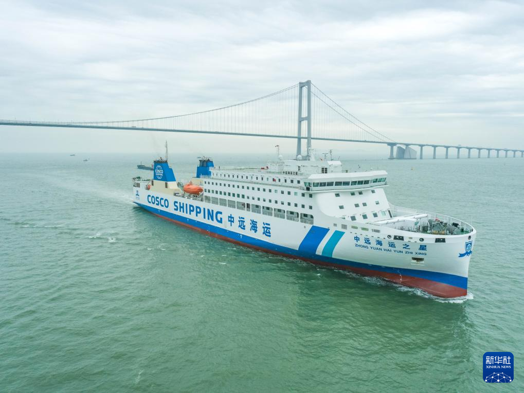 3月11日,“中远海运之星”号客滚船在珠江口试航(无人机照片)。新华社发(钟伟摄)