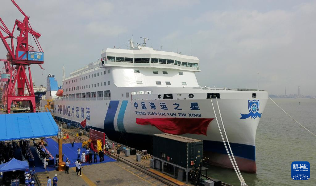 3月27日,“中远海运之星”号客滚船在广州举行命名仪式(无人机照片)。新华社记者 田建川 摄