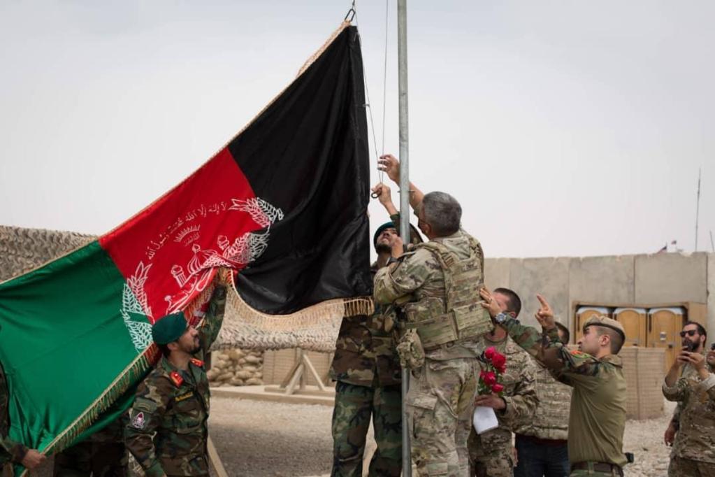 5月2日,阿富汗士兵与美军士兵在阿富汗赫尔曼德省一处军事基地升起阿富汗国旗。(新华社发,阿富汗国防部供图)