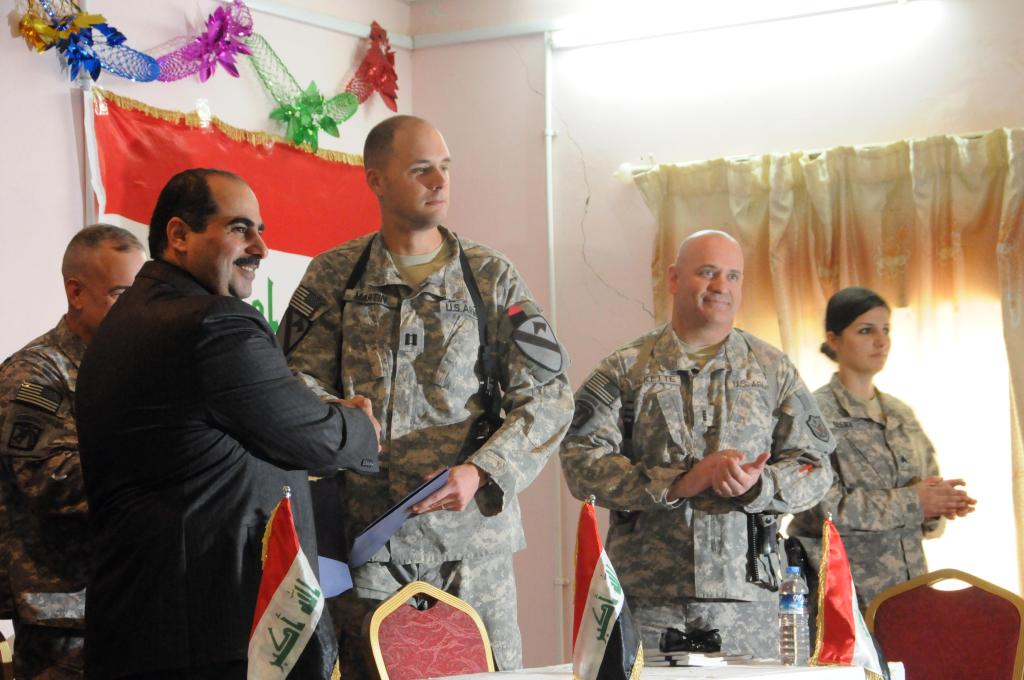 2011年12月14日,在伊拉克迪瓦尼耶陆军第8师师部举行的伊美两军军事基地交接仪式上,伊拉克总理马利基的特派代表阿萨迪(左一)和美军驻军代表交换相关文件。新华社记者张宁摄