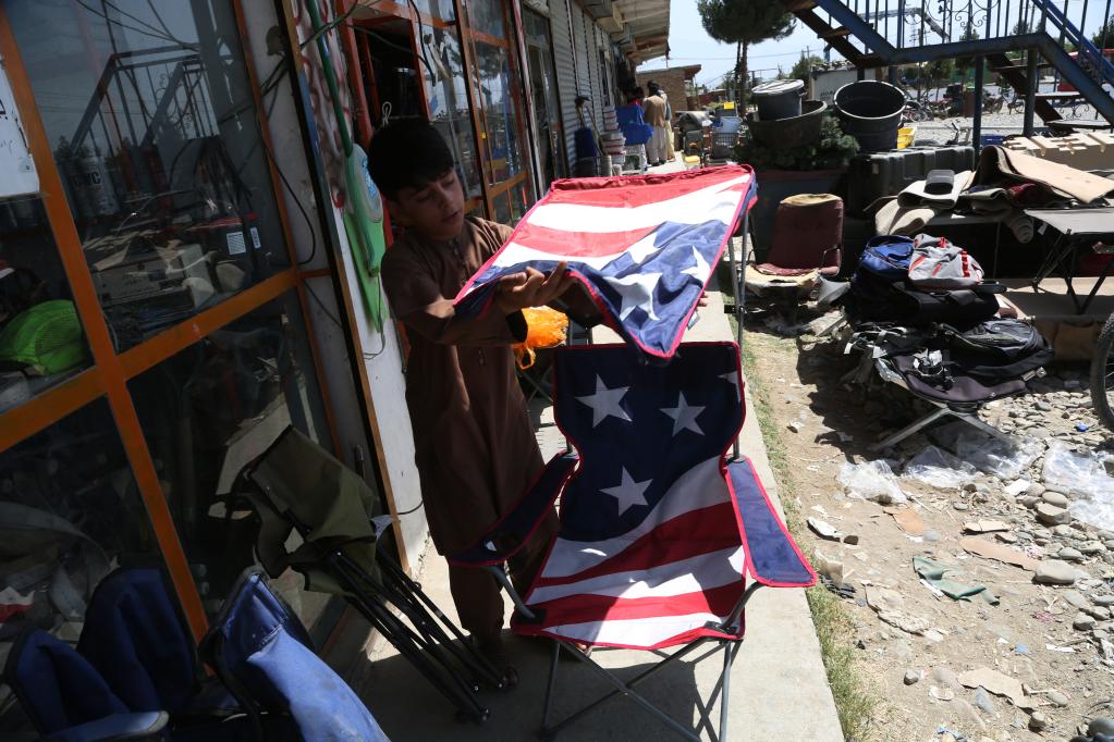7月3日,在阿富汗帕尔万省的巴格拉姆空军基地附近,当地居民在美军遗留下的物品中回收废旧物。新华社发(拉赫马图拉·阿里扎达摄)