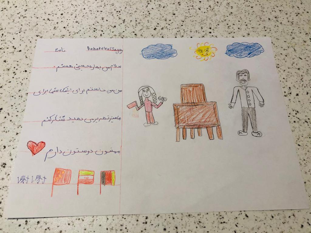 孟雅琪说,大多数孩子画的是中国的五星红旗,有的还画了自己想象中的长城。一些画里,除了有阿富汗国旗和伊朗国旗,还有爱心、阳光等意象,描绘出孩子心中的三国友好关系。孩子们期待的小课桌也被画了进去,旁边还用刚学会的中文写上“谢谢”。