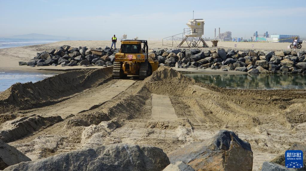 10月3日,工作人员在美国加利福尼亚州奥兰治县一条河道与海滩连接处筑造沙堤,防止原油污水向内陆渗透。