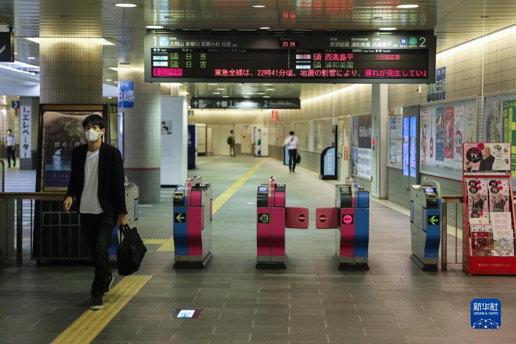 10月7日,在日本东京,一个车站的电子屏幕上显示电车线路受地震影响延迟。新华社记者杜潇逸摄