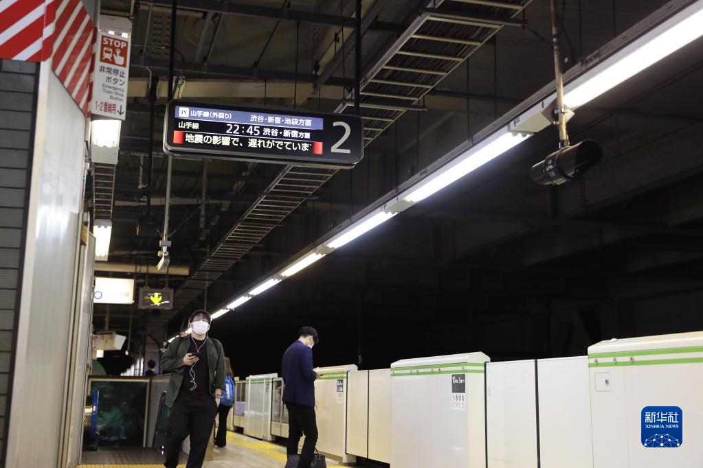 10月7日,在日本东京,乘客在一个车站内等候列车,车站的电子屏上显示电车线路受地震影响延迟。新华社记者杜潇逸摄