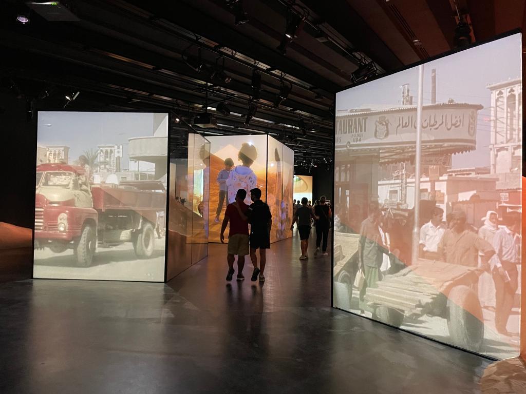 穿过沙漠就到了“梦想家成就者”主题区域。踩着节奏感极强的传统阿拉伯音乐鼓点,参观者完全沉浸其中。十几块透明光电屏幕组成的投影矩阵上展示着不同时代的大量珍贵历史照片,讲述阿联酋人民筚路蓝缕、开拓创新的过程,展示阿联酋在教育、科研、城市建设等多个领域的变化。