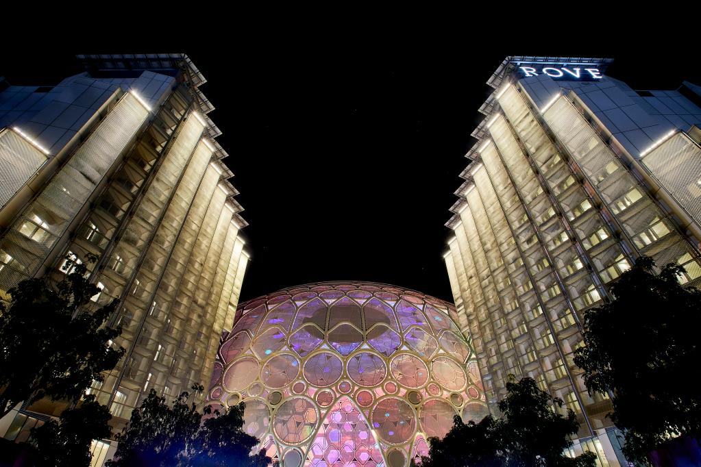 迪拜世博会园区分为“流动性”“可持续性”“机遇”三大主题展区。进入“机遇”展区,径直向前,便可看到识别度极高的穹顶钢架式单体建筑——Al Wasl广场。它被称为迪拜世博会“跳动的心脏”和“皇冠上的宝石”,既是世博会开幕式当晚的主舞台,也将在为期六个月的展会期间举办多场表演和活动。“Al Wasl”在阿拉伯语中意为“连接”,蕴含着世博会将来自世界各地的人们聚集在一起的目标。