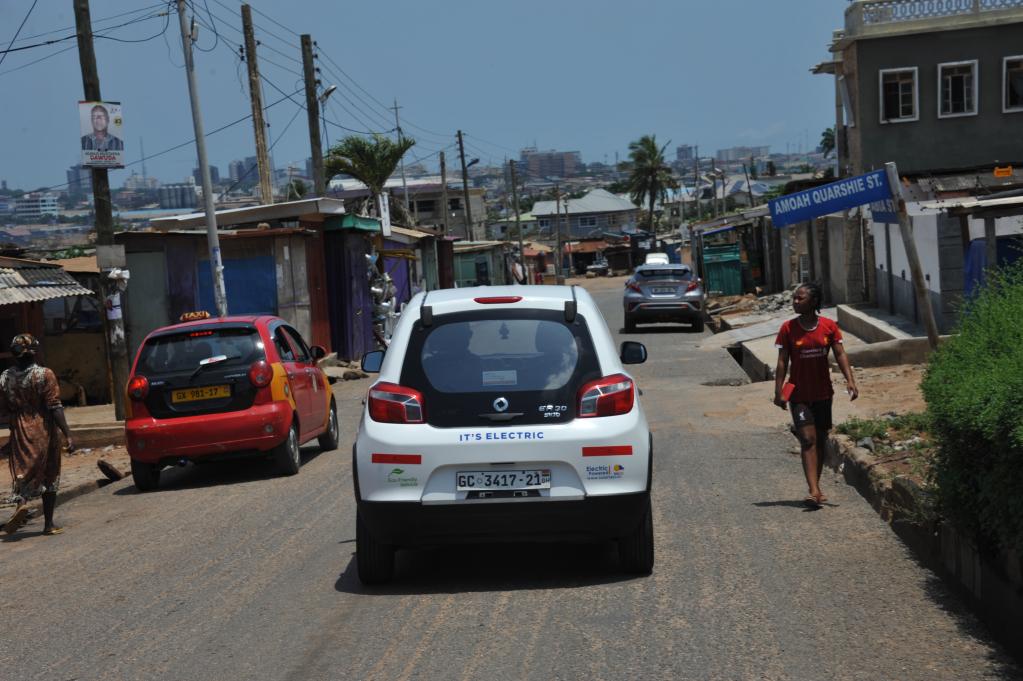 10月8日,一辆从中国进口的电动汽车行驶在加纳首都阿克拉。(新华社发,赛特摄)